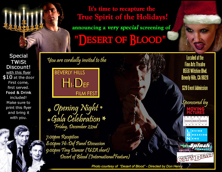 Please join us at the Opening Night Gala Celebration of the movie "Desert of Blood" two of our songs are feature in the film ...so we are so exited !!!>>> I just can't wait !!!... there is going to be a cocktail- food reception and admission will be only $10 (that includes the cocktails and food )-- just need to PRINT the flyer below and BRING IT to the box office that night...so hope to see you then .... Friday Dec 22 7 PMLocated at: The Fine Arts Theatre8556 Wilshire Blvd.Beverly Hills CA 90211